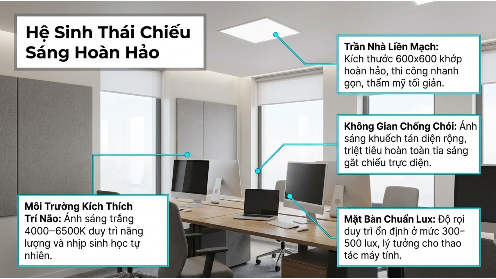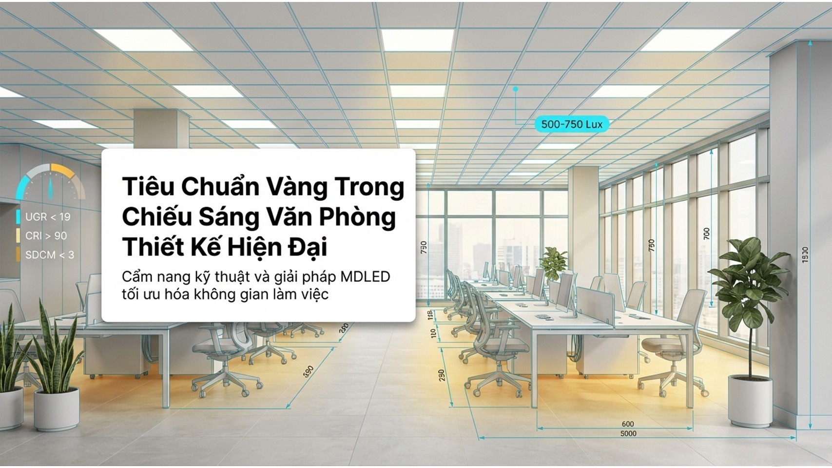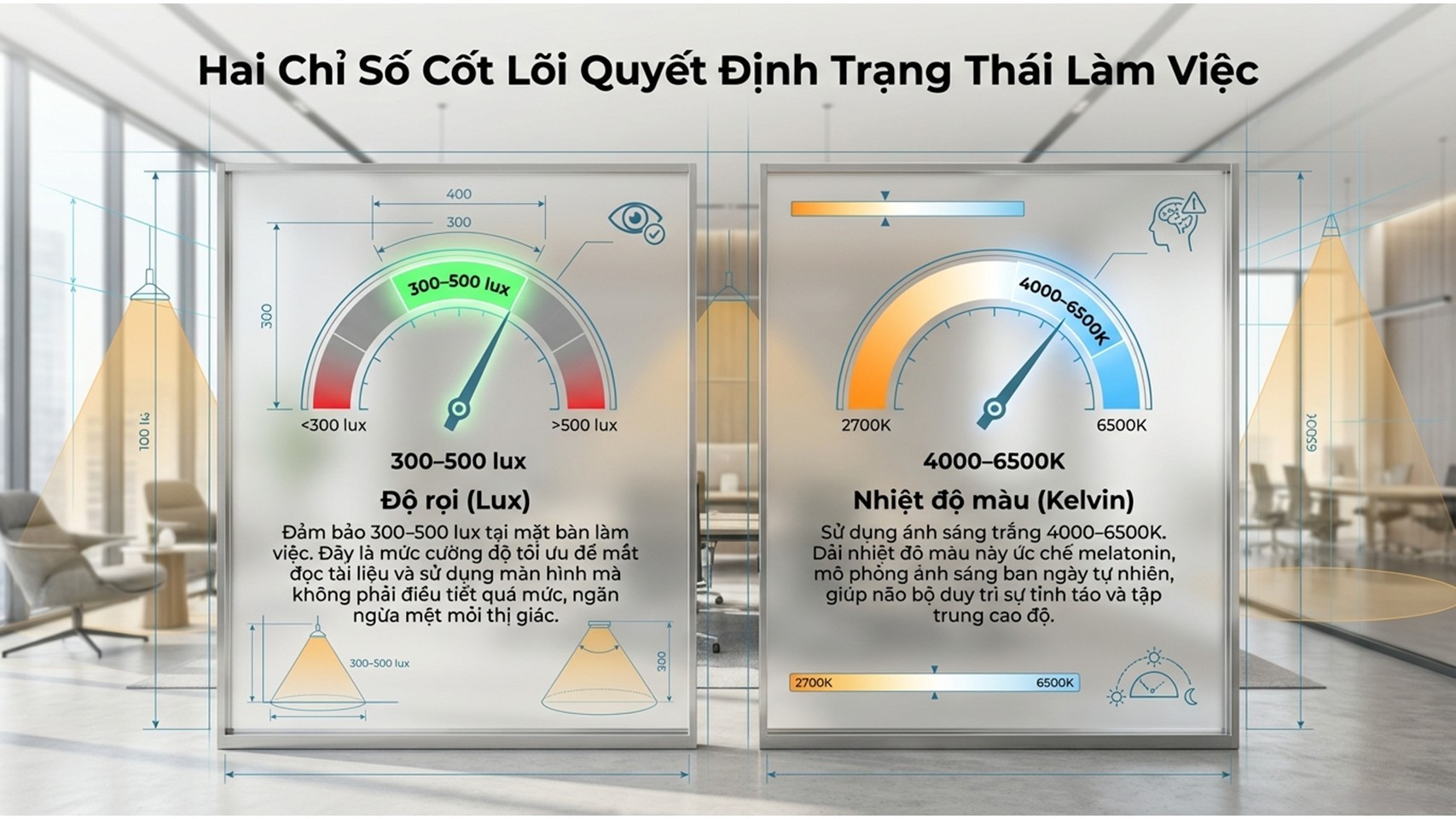 👉 Độ sáng (Lux): 300 – 500 Lux là mức lý tưởng cho văn phòng