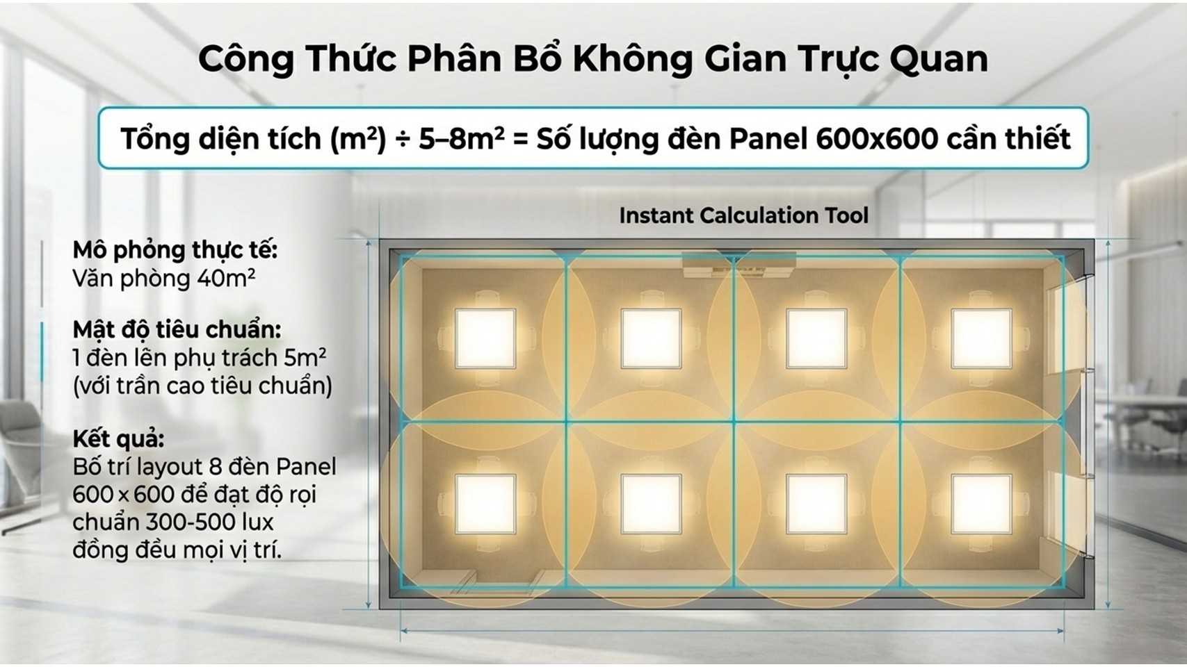 👉 Ví dụ: Văn phòng 40m² → cần khoảng 5 – 8 đèn panel