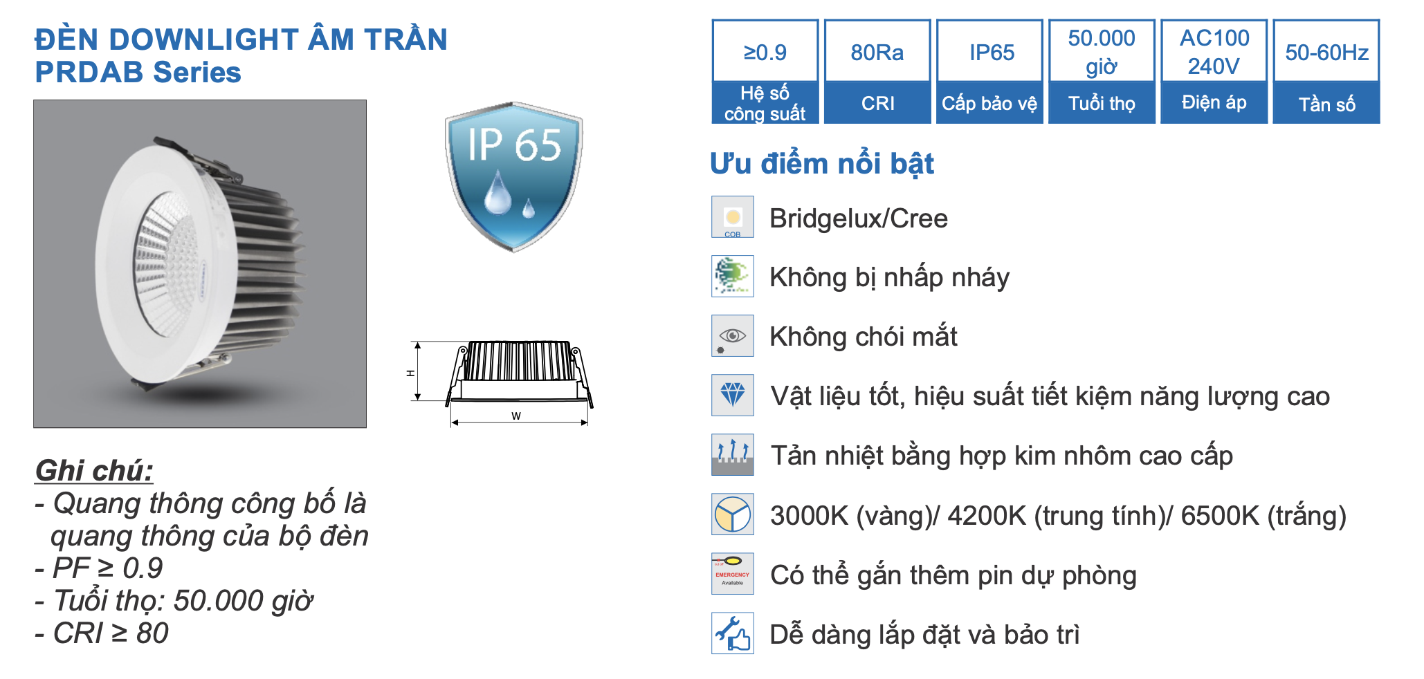Thông Số Kỹ Thuật Của Đèn LED Downlight Chống Thấm 30W Paragon PRDAB164L30