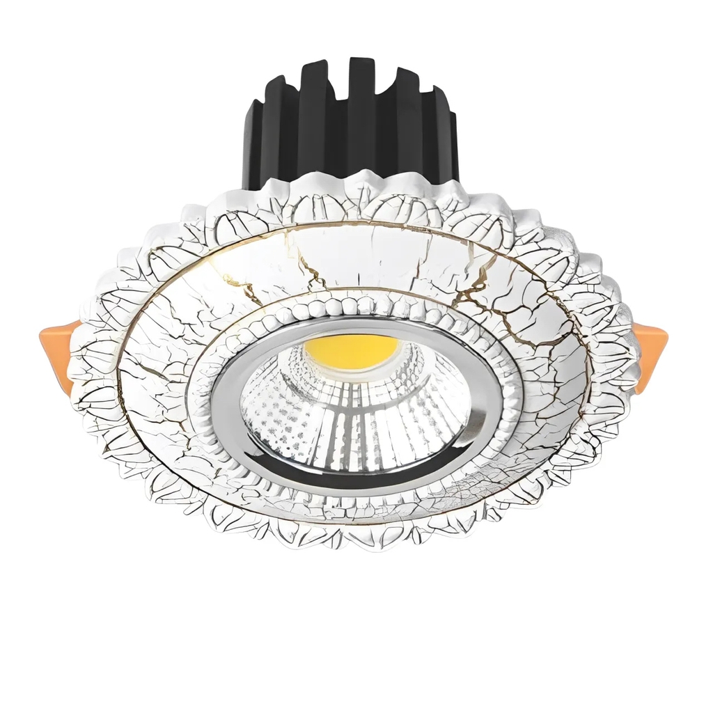 – Chất liệu: Hợp kim nhôm cao cấp, có đế đèn tản nhiệt – Màu viền: Màu trắng, dập hoa văn nổi – Nguồn sáng: LED COB |
