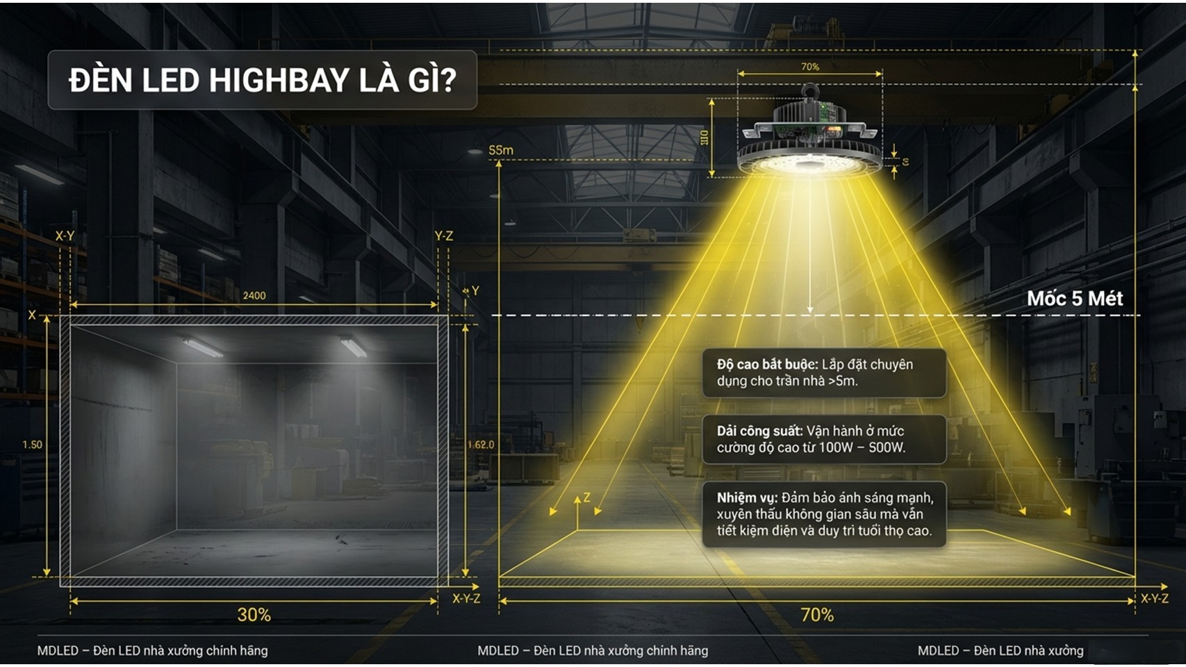 Đèn LED Highbay là dòng đèn chiếu sáng chuyên dụng được thiết kế để lắp đặt ở những không gian có trần cao, thường từ 5m trở lên.