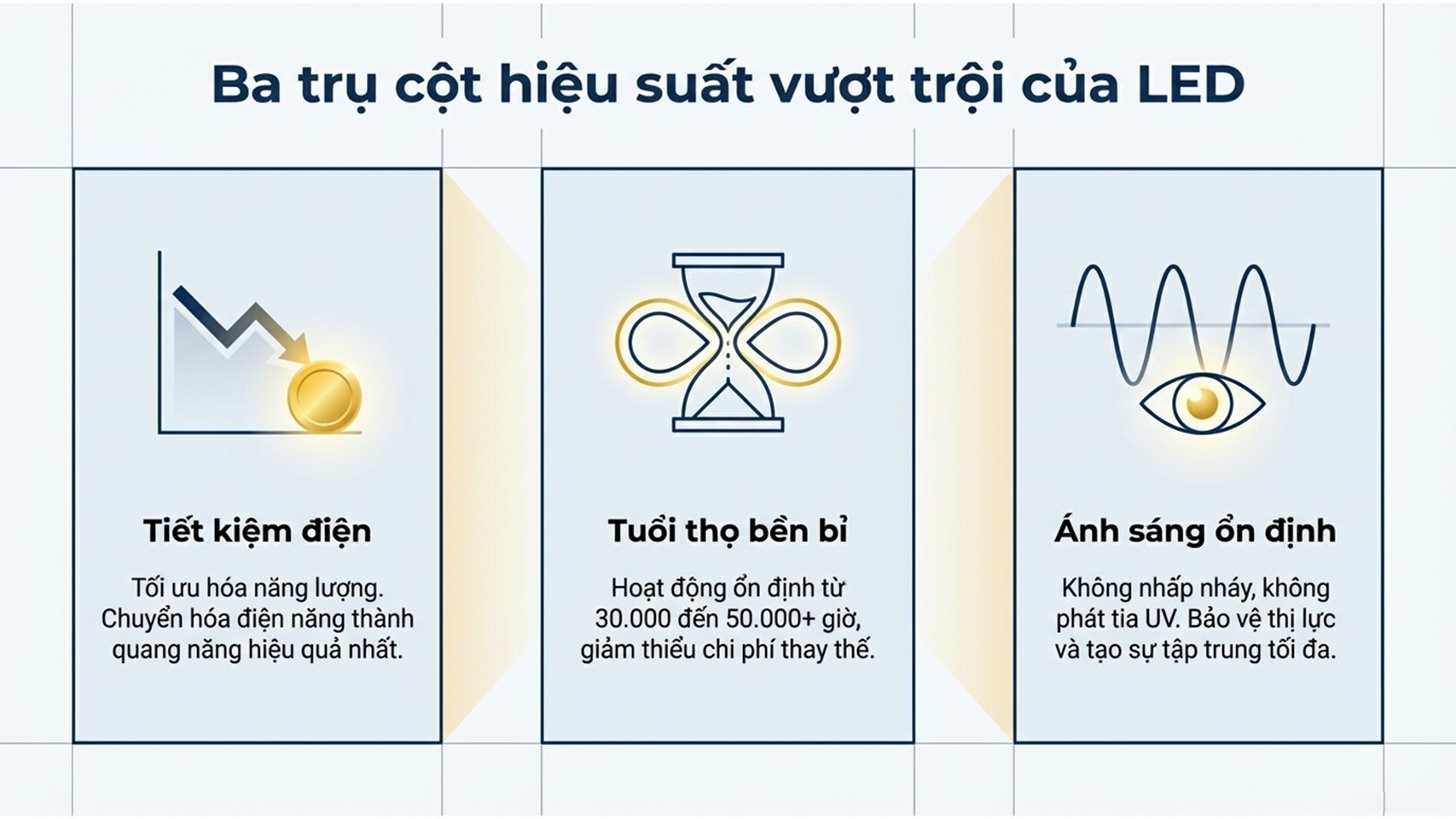 - Đèn LED tiết kiệm đến 50–80% điện năng so với đèn sợi đốt và huỳnh quang.