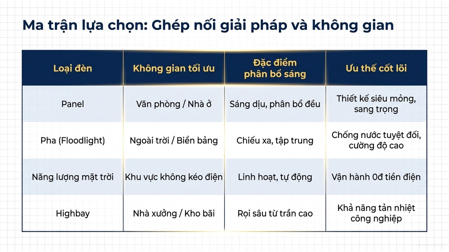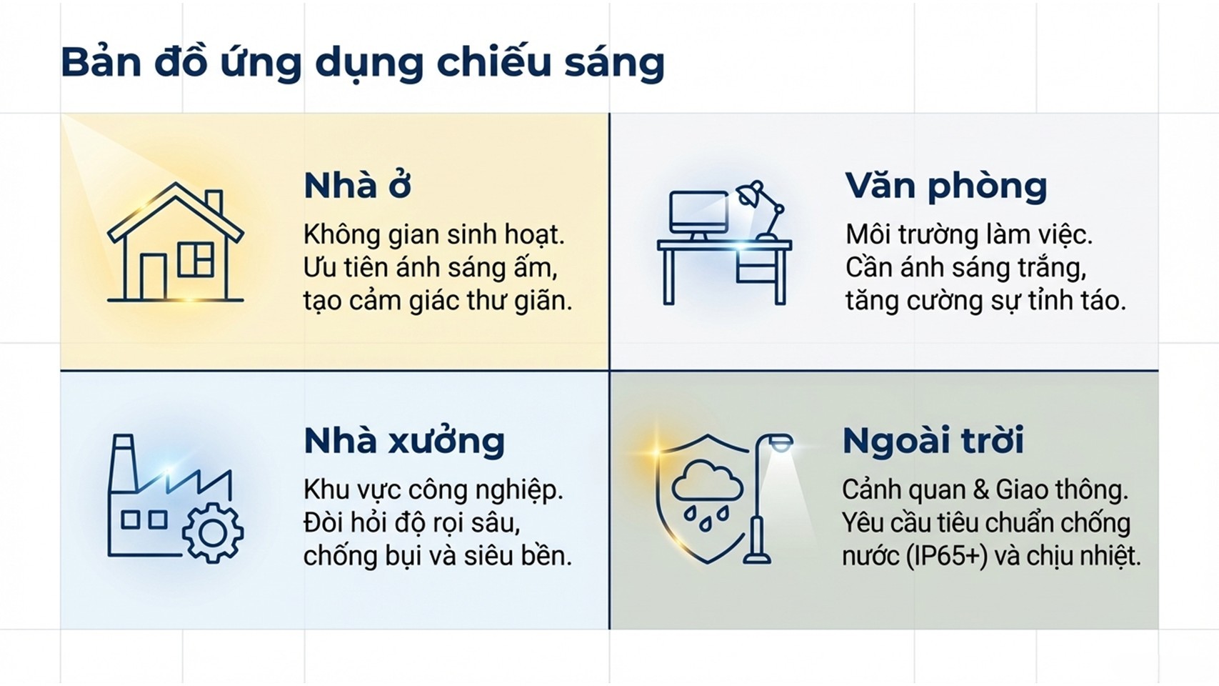 - Nhà xưởng: đèn highbay công suất lớn