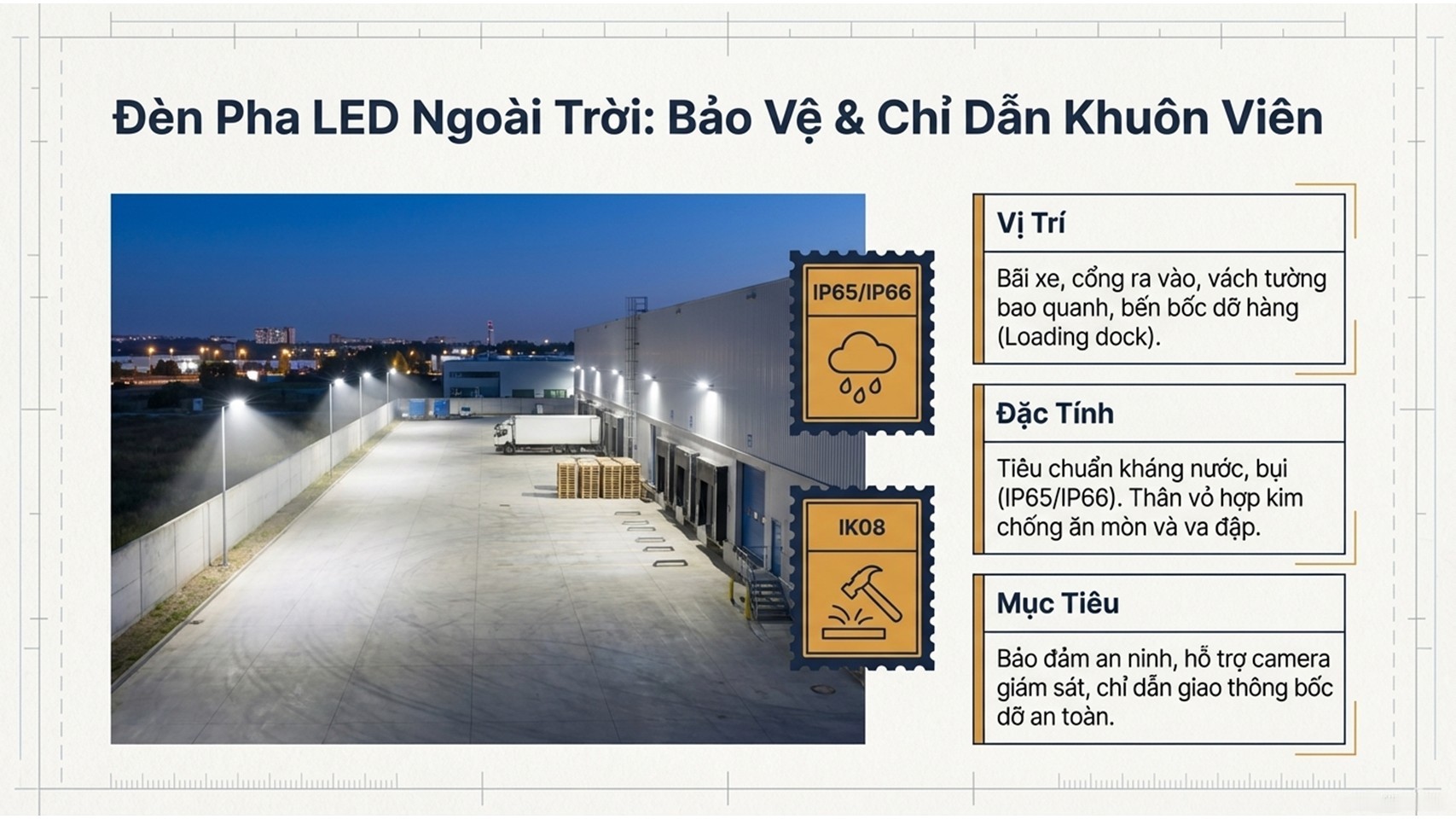 Đèn pha LED dùng cho: sân xưởng, bãi xe, khu xuất nhập hàng