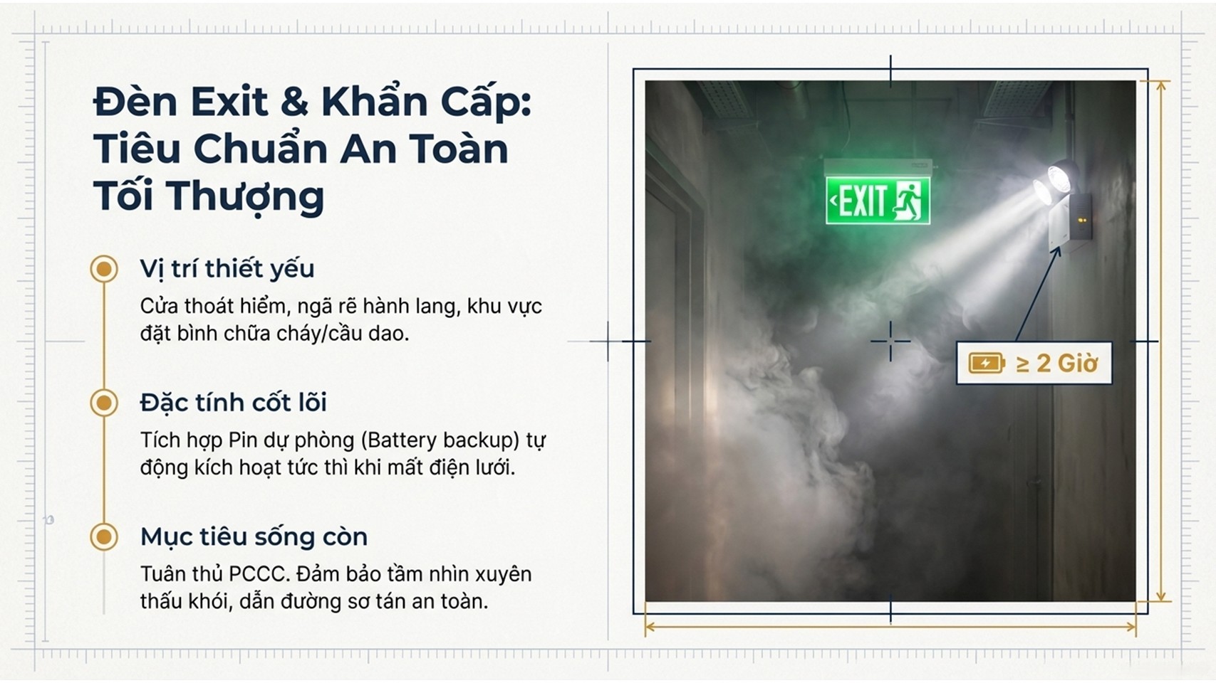 Công dụng: chiếu sáng khi mất điện, chỉ dẫn lối thoát hiểm