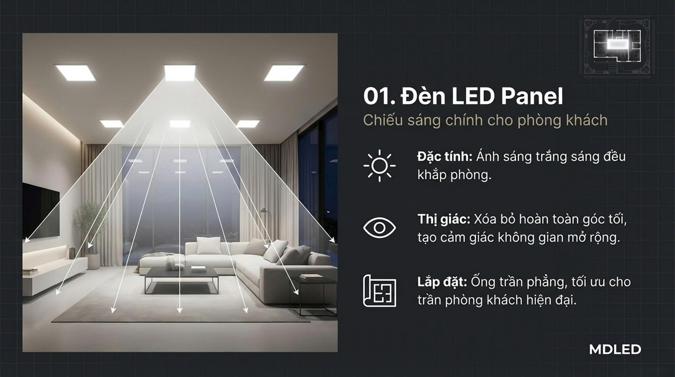 Phòng khách là khu vực cần ánh sáng mạnh và đều. Đèn LED panel là lựa chọn rất phổ biến cho nhà ở hiện đại.